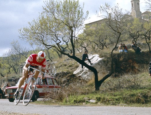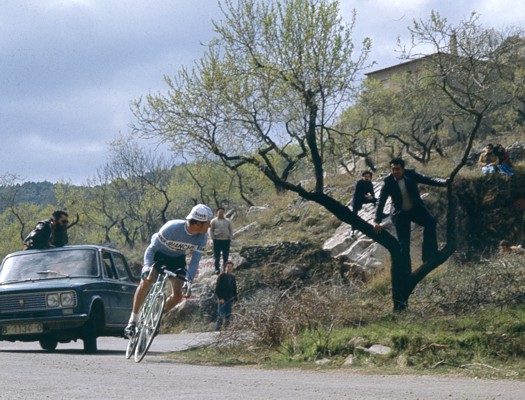 ![]() Felice Gimondi de l'equip Bianchi-Campagnolo, quart classificat a la classificació general. Animat pel Pep Fortet enfilat en un arbre. |