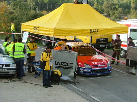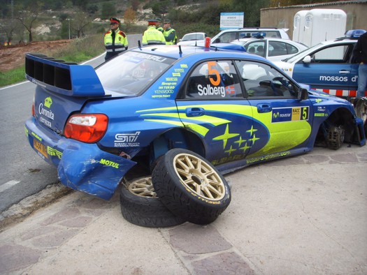 ![]() El Subaru Impreza del campió del món Petter Solberg esperant la grua, davant el cementiri, després de l'accident que va patir a pocs metres del Mas de Fortet. Fotografia: Eurosport |