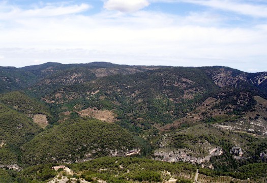 ![]() Situació del mas dins la vall de Capafonts. En primer terme, la Fou per on passa el riu; a mig terme, la partida de Barrulles i, al fons, El Pagès i la serra del Bosc de Poblet. |