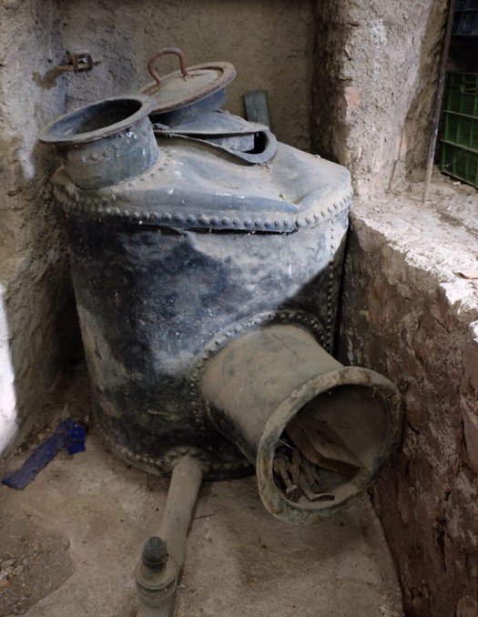 ![]() L'alambí al lloc on era el fornal que fou demolit per poder-lo treure i reparar-lo, cosa que no es va arribar a fer mai. Es pot veure, a la part superior, l'entrada de càrrega i la de sortida de vapor; al mig, una bocana gran per a treure les brises, i a sota, el tub per a buidar l'alambí. Fotografies: Albert Balanyà |