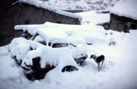 ![]() Una altra fotografia feta l'any 1986 on hi podém veure cal Macià amb la façana coberta de neu per culpa del vent. |
